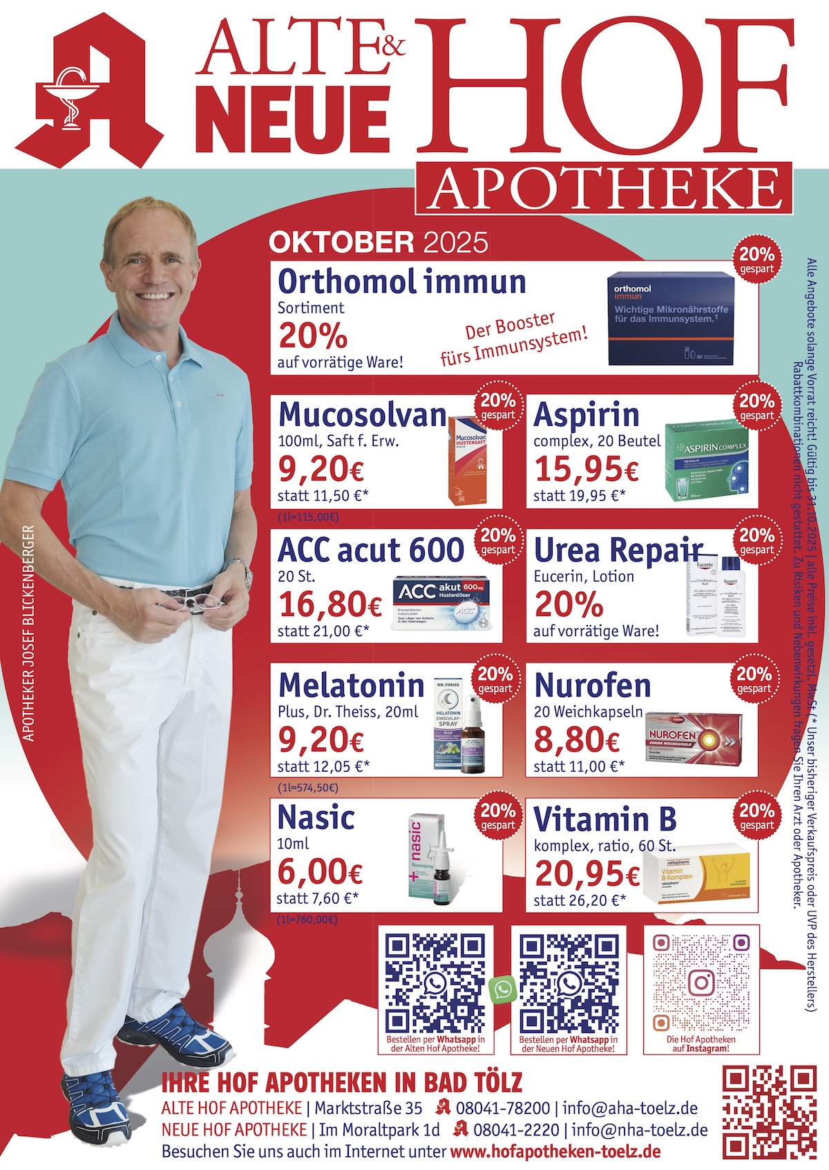 Jeden Monat bieten die Hof Apotheken in Bad Tölz eine Reihe von Angeboten an, bei denen Sie bares Geld sparen können! Nutzen Sie unsere Sonderangebote und besuchen Sie uns in eine der beiden Filialen!